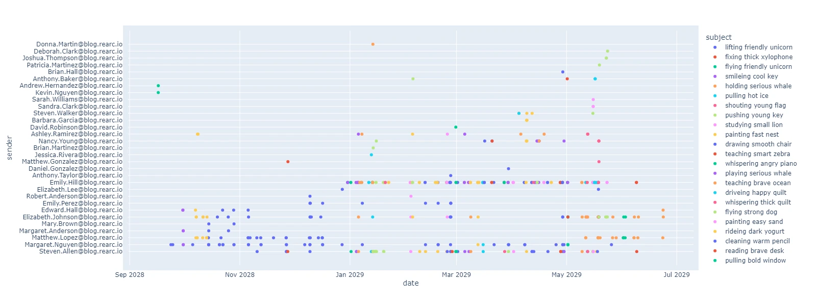 With respect to correlating all messages in their respective chains, this is the most crucial part of all our preprocessing. In the end, all that matters is that related messages all wind up with some reliably correlating field to use in our plots (below). With this cleanup pass, the subject line is now that correlating field.